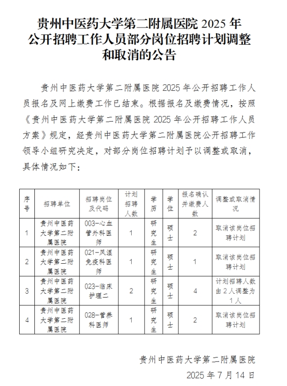 贵州中医药大学第二附属医院2025年公开招聘工作人员部分岗位招聘计划调整和取消的公告
