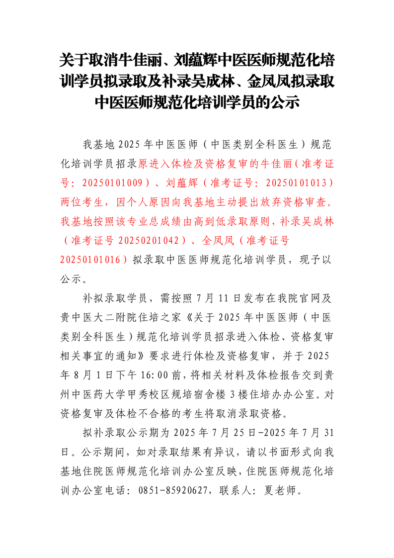 关于取消牛佳丽、刘蕴辉中医医师规范化培训学员拟录取及补录吴成林、金凤凤拟录取中医医师规范化培训学员的公示