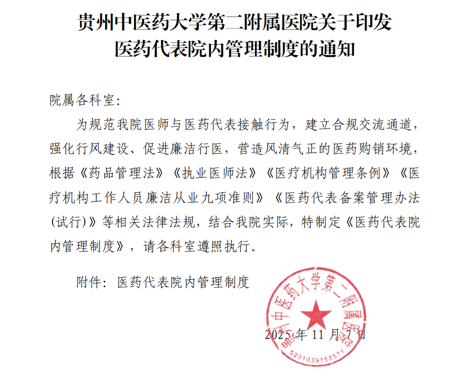 贵州中医药大学第二附属医院关于印发医药代表院内管理制度的通知