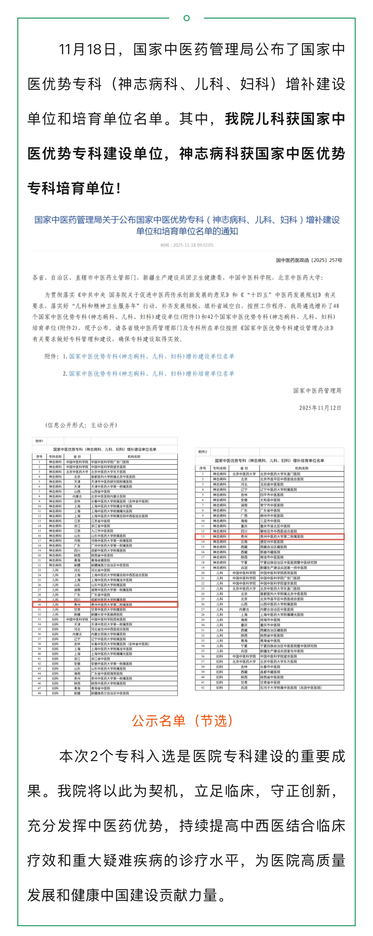 我院儿科、神志病科入选国家中医优势专科建设单位和培育单位