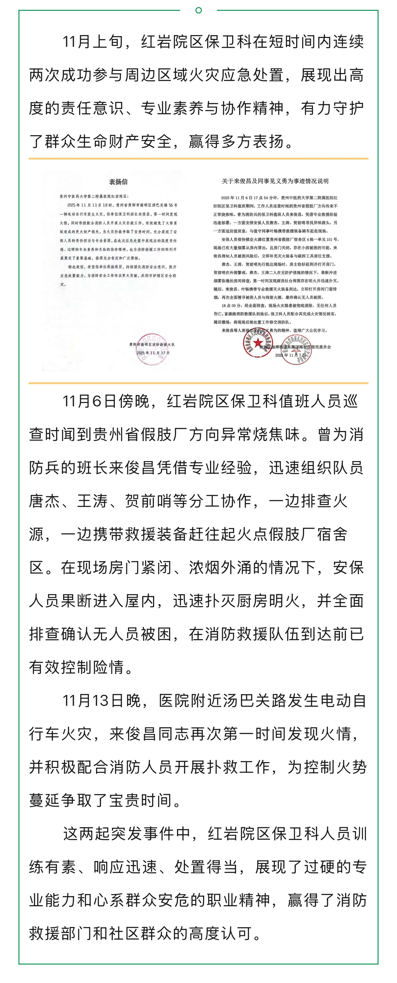 红岩院区保卫科成功处置周边火情,守护群众安全,赢得多方表扬