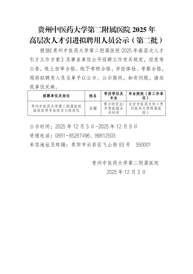 贵州中医药大学第二附属医院2025年 高层次人才引进拟聘用人员公示(第二批)