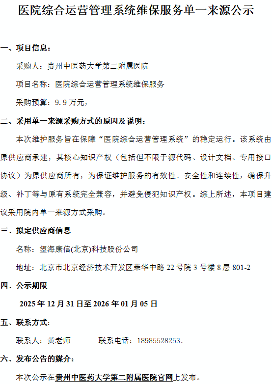 医院综合运营管理系统维保服务单一来源公示