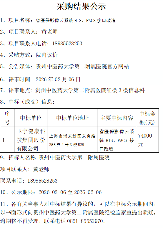 省医保影像云系统HIS、PACS接口改造采购结果公示