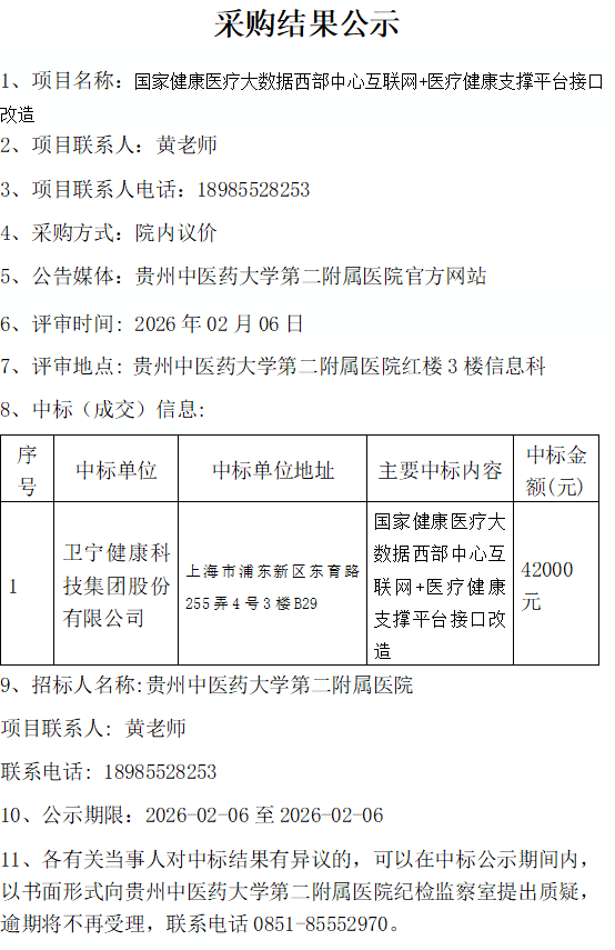 国家健康医疗大数据西部中心互联网+医疗健康支撑平台接口改造采购结果公示