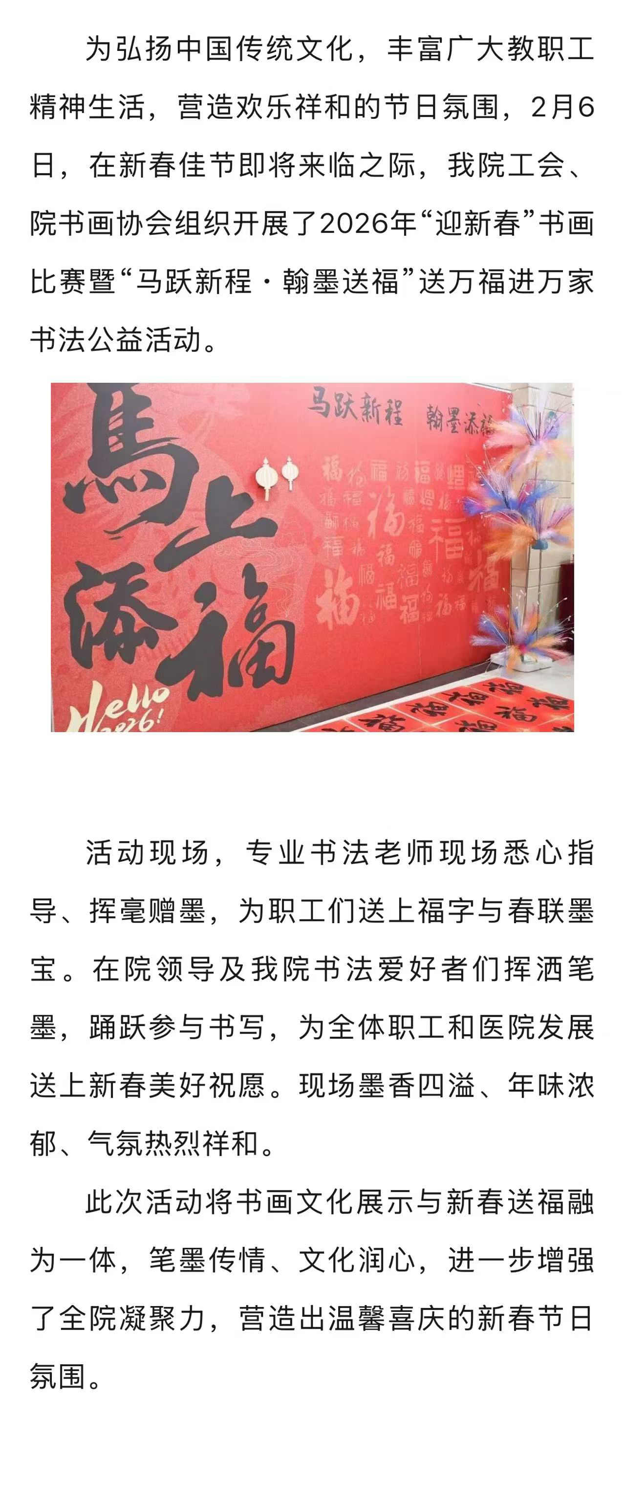 我院举办 2026年“迎新春”书画比赛暨 “马跃新程・翰墨送福”送万福进万家书法公益活动