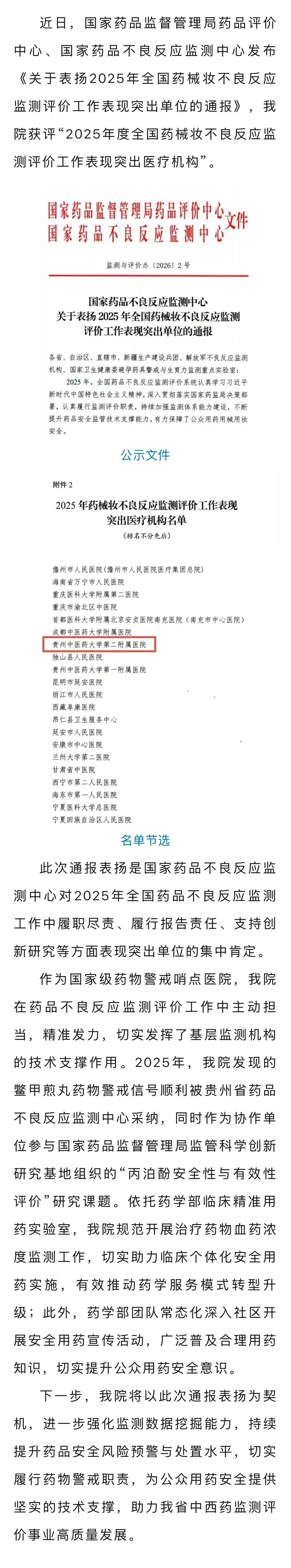 喜报丨我院获评2025年度国家药械妆不良反应监测工作突出单位