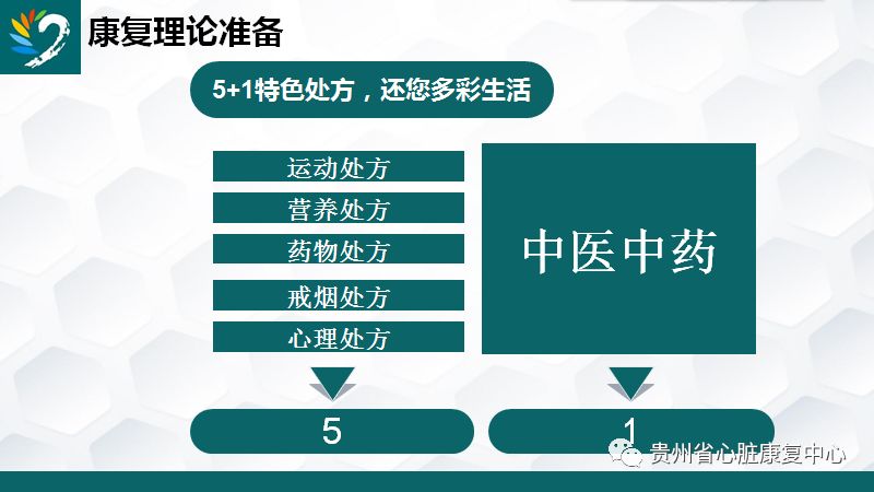 我们康复中心结合中西医药以“气脉常通,德全能寿”为理念,涵盖5+1特色处方,即药物处方、运动处方、营养处方、戒烟处方、心理处方、中医中药处方。